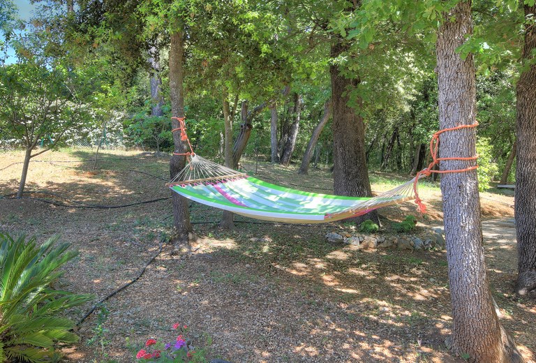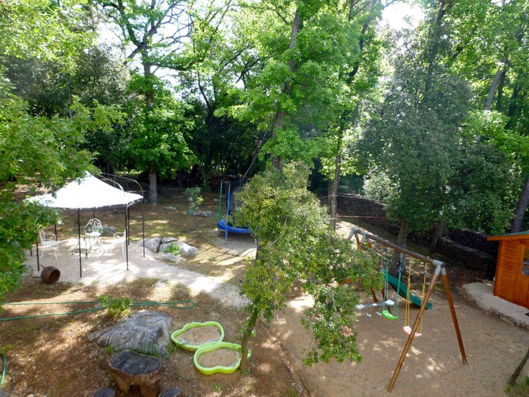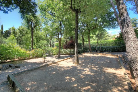 Dans la restanque inférieure, en-dessous de la piscine, se trouve le jeu de Pétanque éclairé pour les jeux en soirée, invitant les équipes à pratiquer ce sport français typique, tandis que les amis et la famille peuvent apprécier et encourager les joueurs tout en se reposant sur deux bancs confortables.
