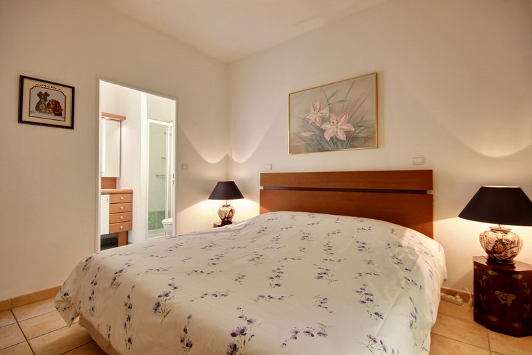 Les deux chambres du rez de chaussée sont semblables, l'une ( ci-dessus) a une porte coulissante donnant sur l'aire de jeux à l'arrière, l'autre , devant , donne accès à la piscine. Les deux communiquent avec leur douche /wc .